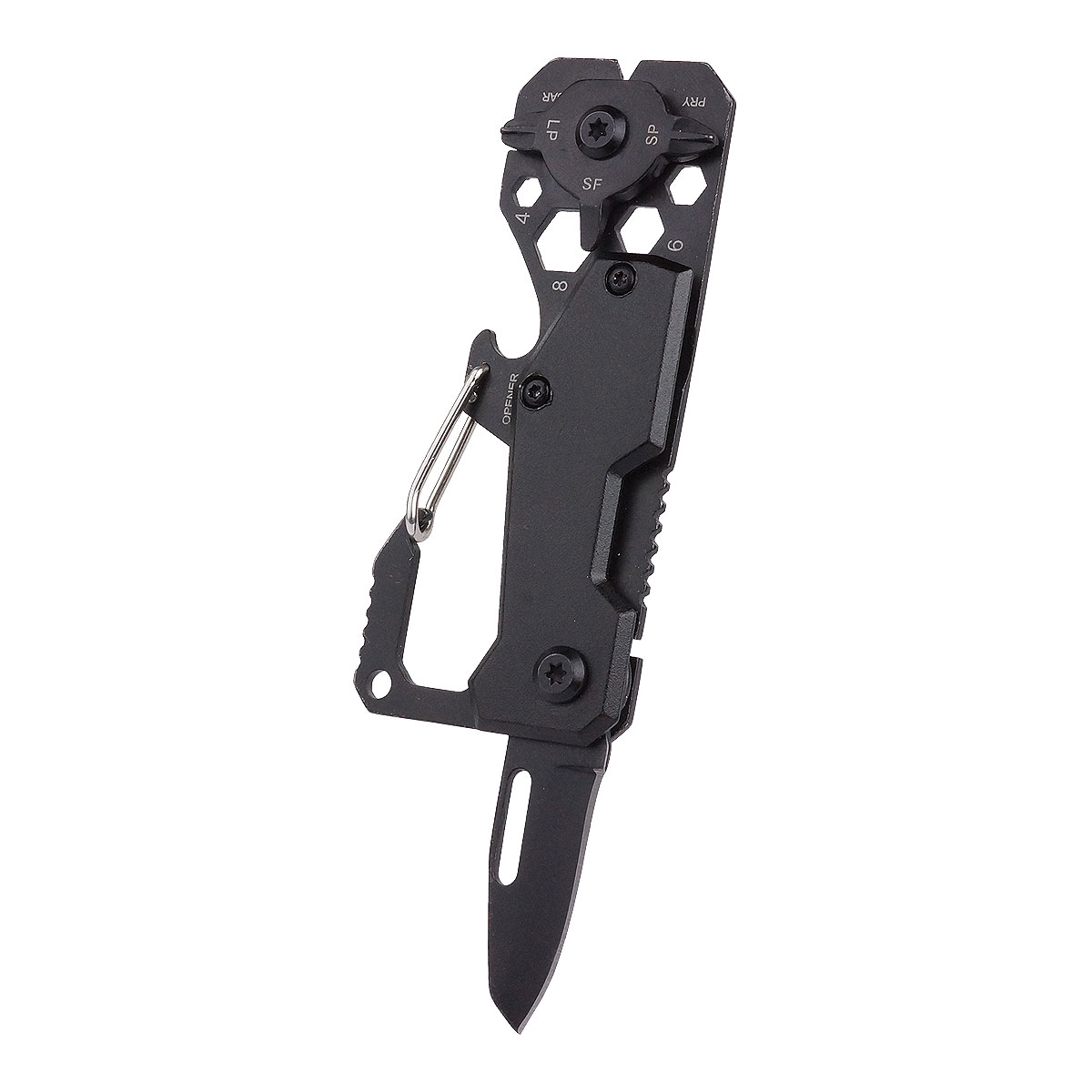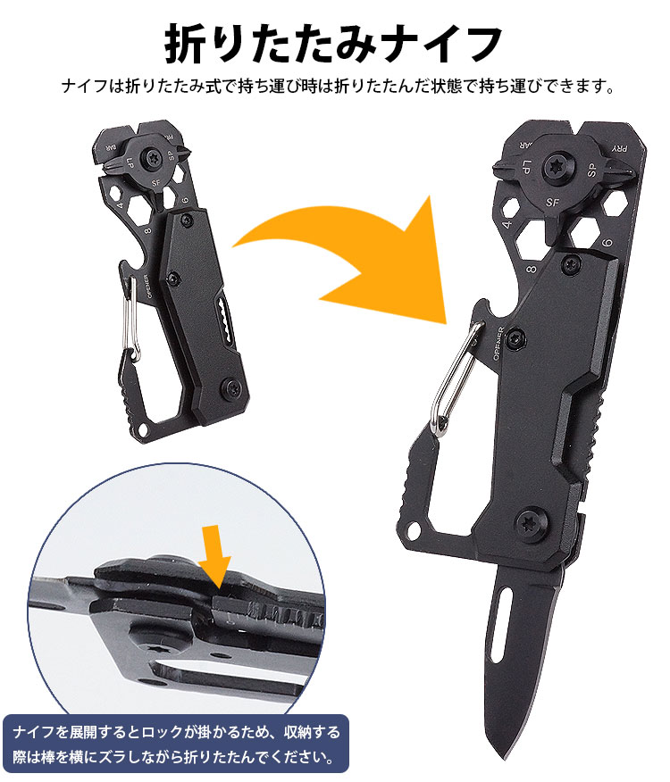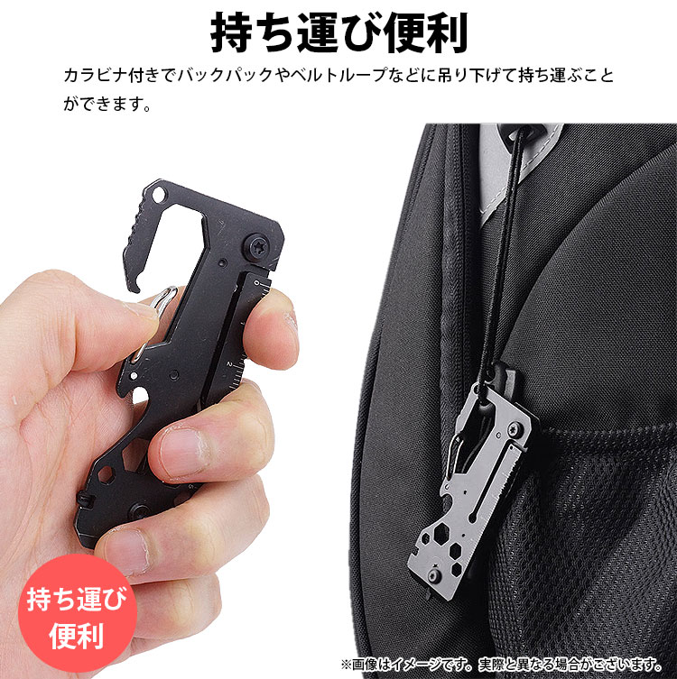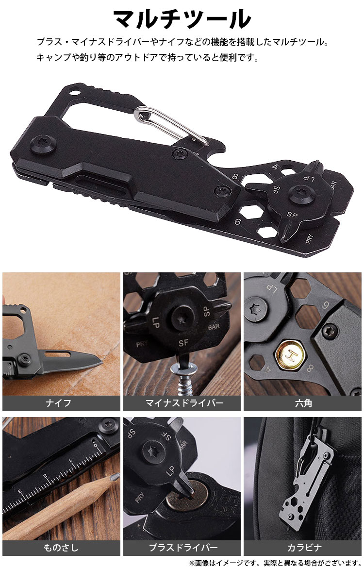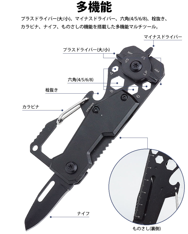 プラスドライバー(大/小)、マイナスドライバー、六角(4/5/6/8)、栓抜き、カラビナ、ナイフ、ものさしの機能を搭載した多機能マルチツール。