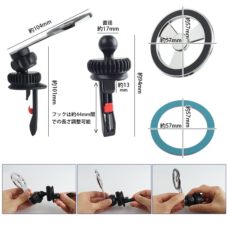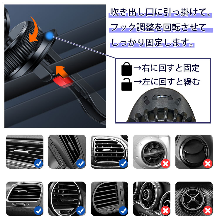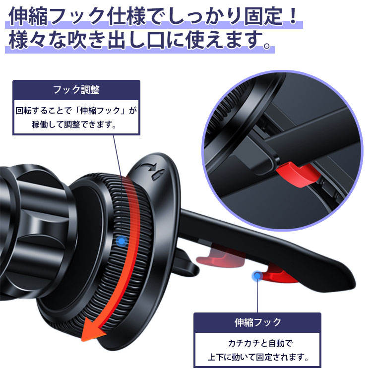 伸縮フックが搭載されているので吹き出し口にしっかりと固定されます。