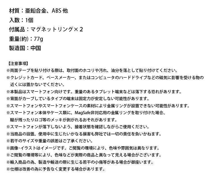 ※スマートフォン本体やケース類に、MagSafe非対応用の金属リングを取り付けた場合、糊が残ったりロゴ等のメッキが剥がれるおそれがあります。
