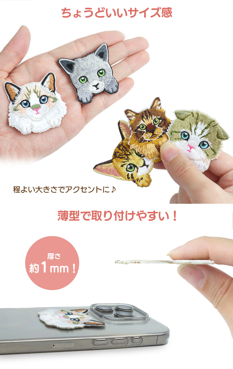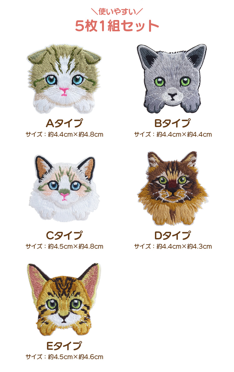 5種類各1枚入り。猫好きにはたまらない刺繍ワッペンです。