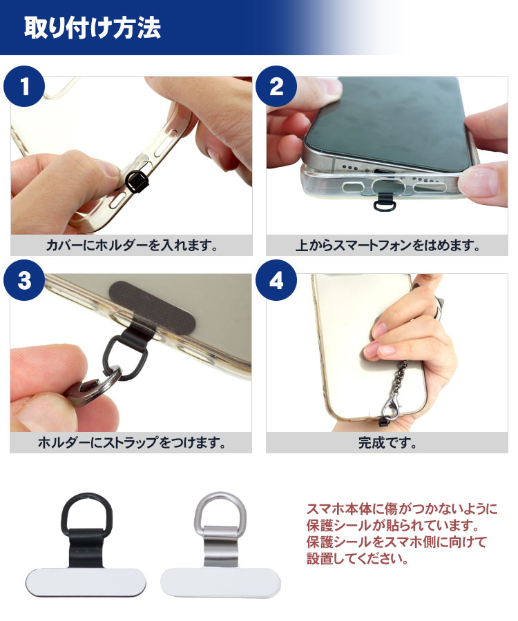 ※ストラップホルダーにスマホ本体に傷がつかないように保護シールが貼られています。