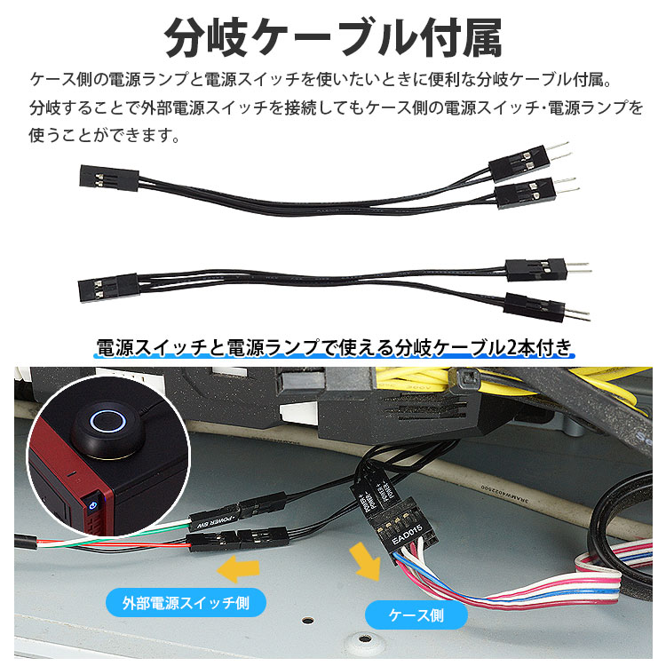 分岐することで外部電源スイッチを接続してもケース側の電源スイッチ・電源ランプを使うことができます。
