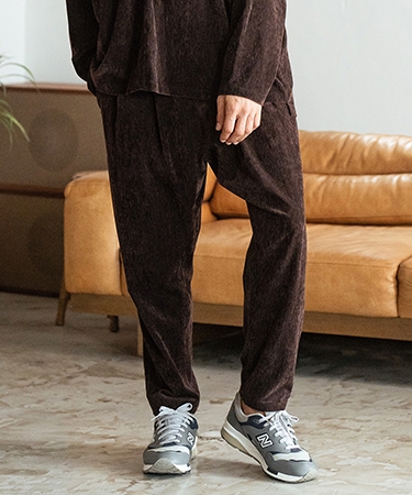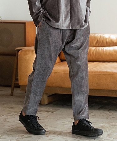 ベロアを使用したテーパードパンツです。ベロアは今シーズンのトレンドファブリックの1つ。ベロアのもつモードな雰囲気に、モダンなシルエットを組み合わせた1着。秋冬シーズンらしい起毛表情で滑らかな手触りのベロアを使用しています。柔らかく、ストレッチ性もありストレスのない着用感。楊柳タッチな縦畝の編み感があり、程良い表面変化を感じられるベロアです。膝から裾にかけて、テーパードを施しシャープさを加えています。股下寸法は、通常比で少し短めに設定し、スッキリした見え方になるイメージにしています。フロント身頃にタックを配し、ナチュラルに描かれたドレープとボリュームを演出。ウエストは、平ゴムとスピンドルを配したイージー仕様を採用しています。※着用画像と商品単体画像で色が異なる場合がございます。※商品単体画像を実物により近づけております。