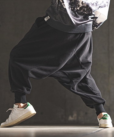 ワタリ・ヒップ周り・股上を大胆にワイドに設定したたっぷりとしたシルエットをベースに、裾口にリブを配して足首でキュッと絞ったサルエルパターンです。