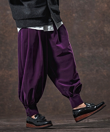 光沢感がきれいなベルベット生地を使用したベルベットタックパンツ。
