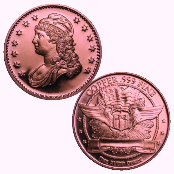 ●アメリカ キャップドバスト / 着帽女神胸像 ラウンド銅貨 コッパー 純銅1オンス インゴット カプセル付き