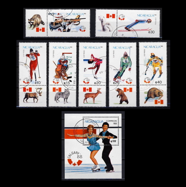 ■ニカラグア切手 1988年 カルガリー五輪 / オリンピック シート+7種完 初日印