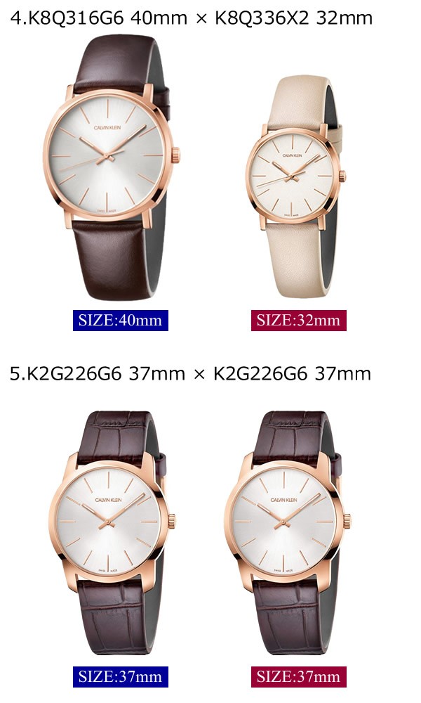 【Calvin Klein】 カルバン・クライン ペアウォッチ レザー 腕時計 ポッシュ POSH シティ CITY 3気圧防水 ck-pair16※こちらの商品は2本セット商品でございます。 [仕様] ETA製クォーツムーブメント 日常生活防水[メンズ/k8q316g6、k8q316c3] サイズ:約縦(H)40mm×横(W)40mm×厚(D)10mm(ラグ、リューズを除く)重量:約55g腕周り:最大約20cmバンド幅:約22mm[レディース/k3m226g6] サイズ:約縦(H)35mm×横(W)35mm×厚(D)7mm(ラグ、リューズを除く)重量:約30g腕周り:最大約18cm、最小約13cmバンド幅:約18mm[レディース/k8q336x2] サイズ:約縦(H)32mm×横(W)32mm×厚(D)8mm(ラグ、リューズを除く)重量:約33g腕周り:最大約18cm、最小約13cmバンド幅:約18mm[同サイズペアウォッチ/k8q336x2]サイズ:約縦(H)37mm×横(W)37mm×厚(D)8mm(ラグ、リューズを除く)重量:約110g腕周り:最大約19cm、最小約14cmバンド幅:約20mm[素材] ケース:ステンレススチール バンド:ステンレススチール 風防:ミネラルクリスタル強化ガラス