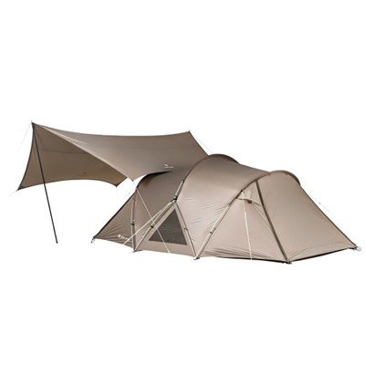 リビングスペース(タープ)は、ランドネストドームとマッチするデザインの風に強いヘキサ型タープです。
