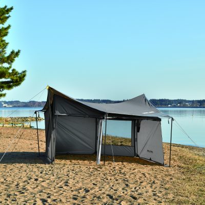 専用タープと組み合わせてシェルター仕様で楽しめる。