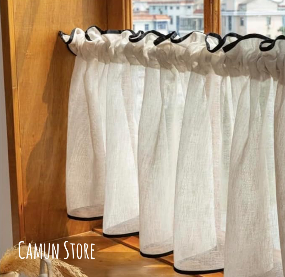 縁取りの黒いテープがお洒落なカフェカーテン。