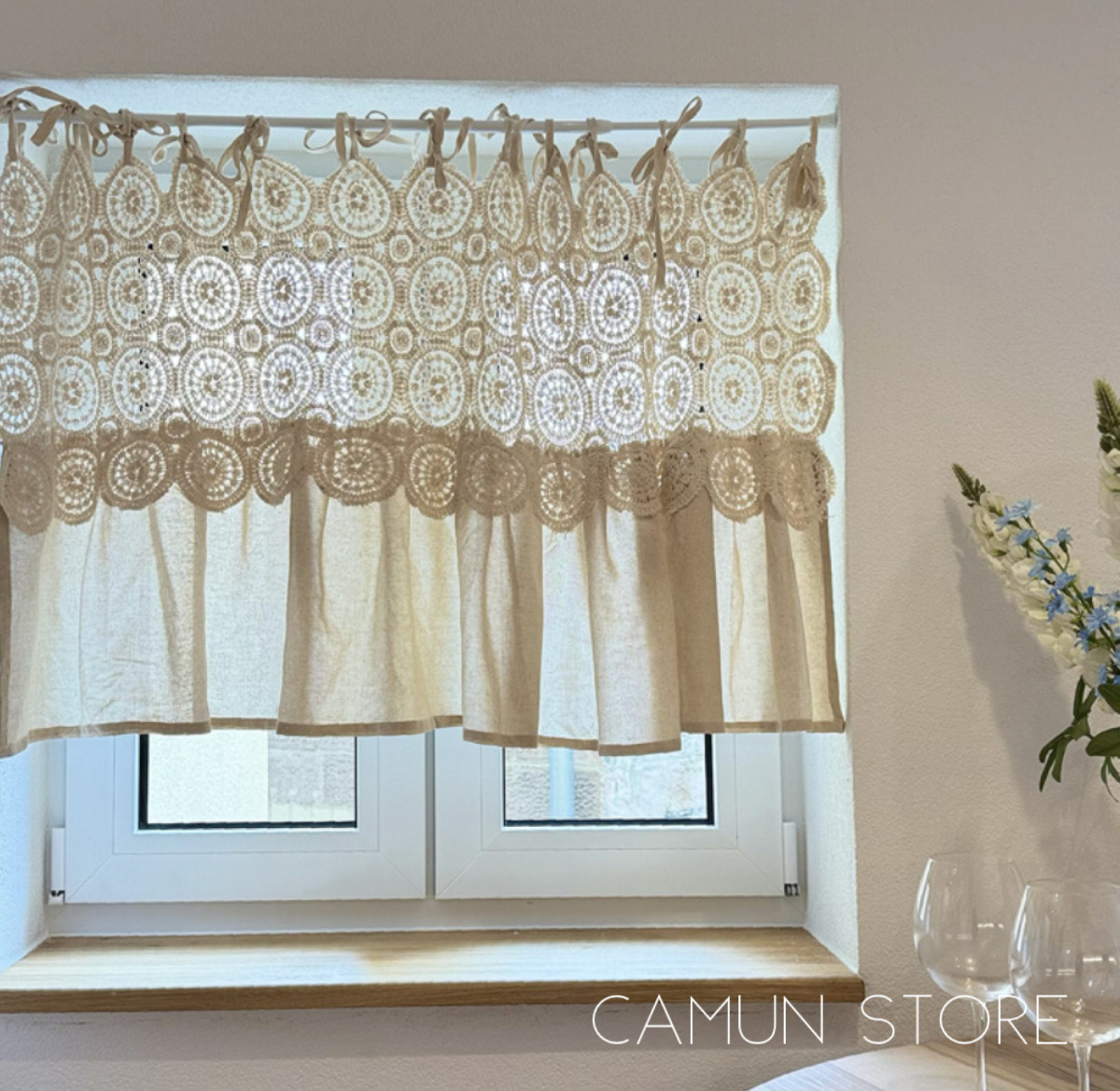 生成りの糸で編み上げたレースにフリルを付けたカフェカーテン。