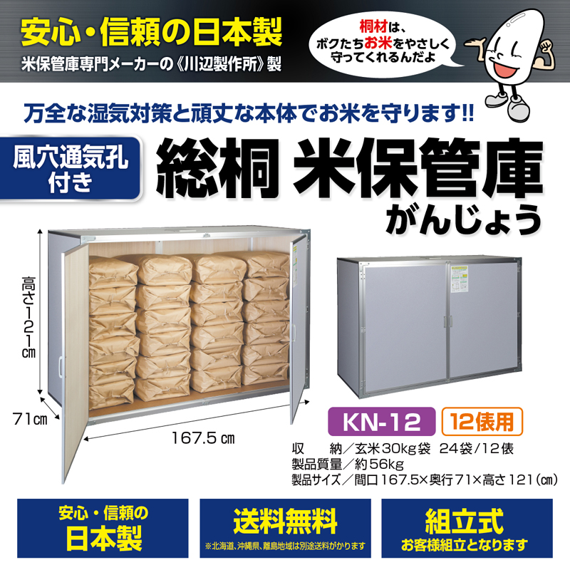 【4月末頃出荷予定】総桐米保管庫(米収納庫)KN-12 12俵用(30kg袋×24)風穴通気孔付 日本製 川辺製作所 玄米保管庫 湿気カビ対策
