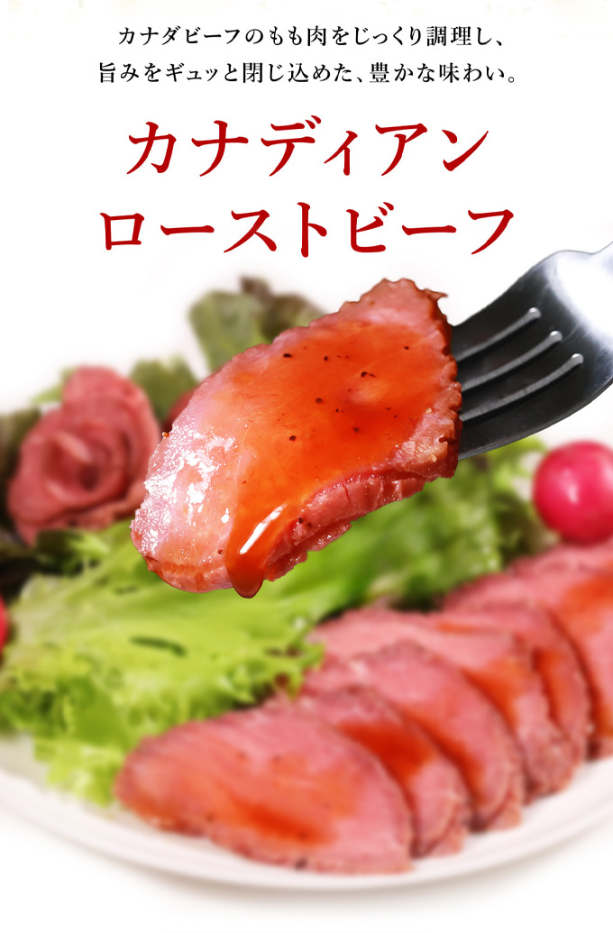 原材料名:【ローストビーフ】牛肉(カナダ産)食塩、香辛料、粉末醤油、蛋白加水分解物、チキンエキス/調味料(アミノ酸等)、(一部に小麦・乳成分・大豆・牛肉・鶏肉・豚肉・ごまを含む)