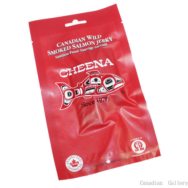 ●サーモンジャーキーちょっと一言:天然の西海岸産サーモンをつぶして混ぜ合わせてから燻製にし、スライスして乾燥させました。本サーモンジャーキーはBC州にある澄んだ水に住む天然太平洋サーモンからつくられています。おいしく見た目もよくお土産や健康食品としても最適です。