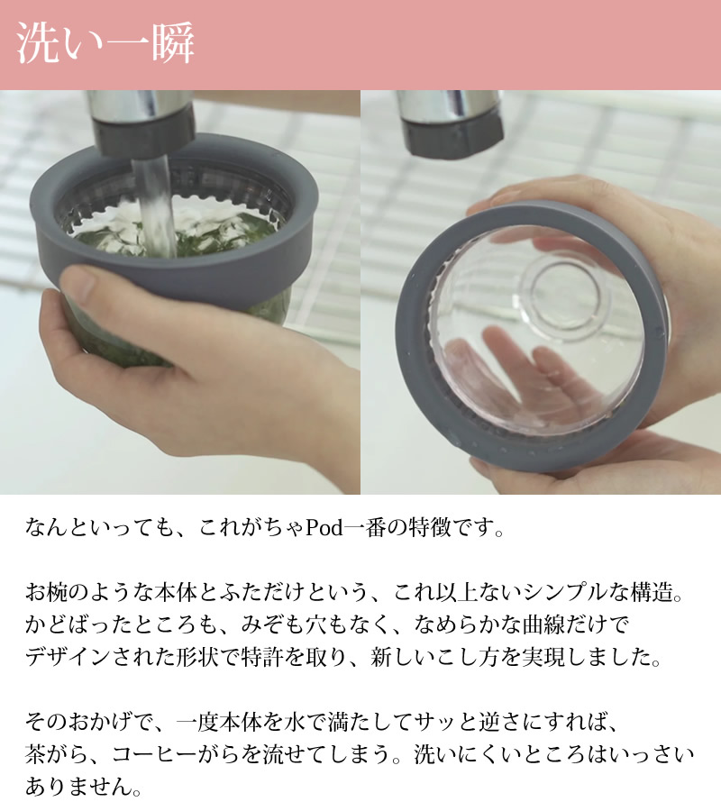そのおかげで、一度本体を水で満たしてサッと逆さにすれば、茶がら、コーヒーがらを流せてしまう。