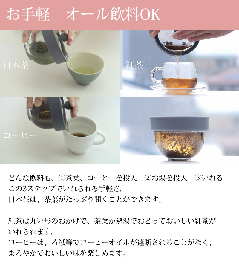 すべてのお茶とコーヒーを手軽に楽しめる。樹脂製なので、熱くなく、軽く、割れない。