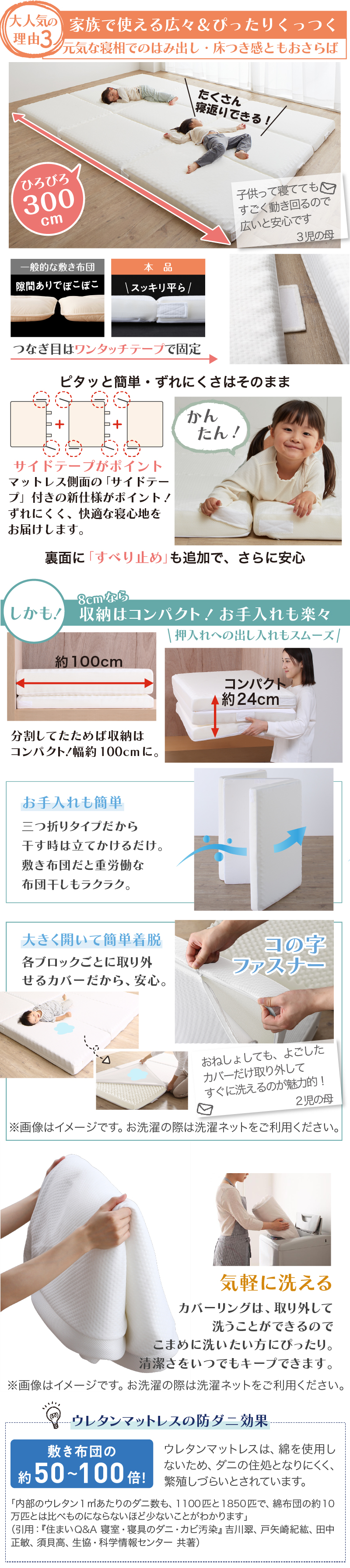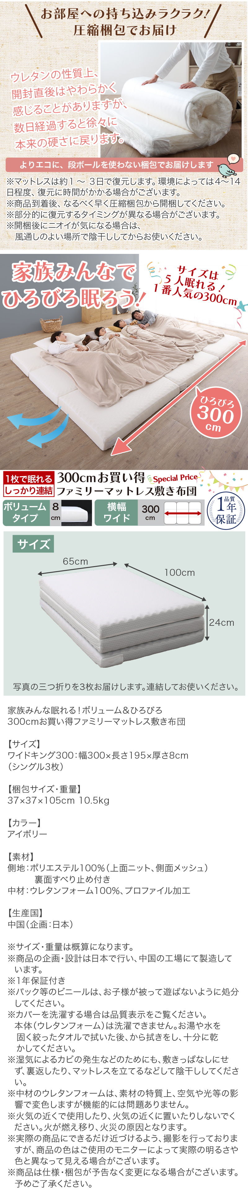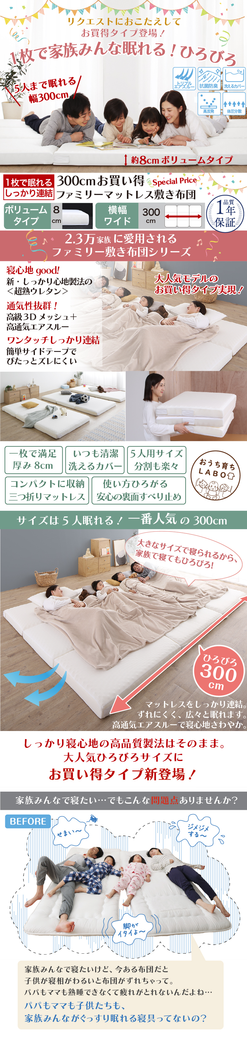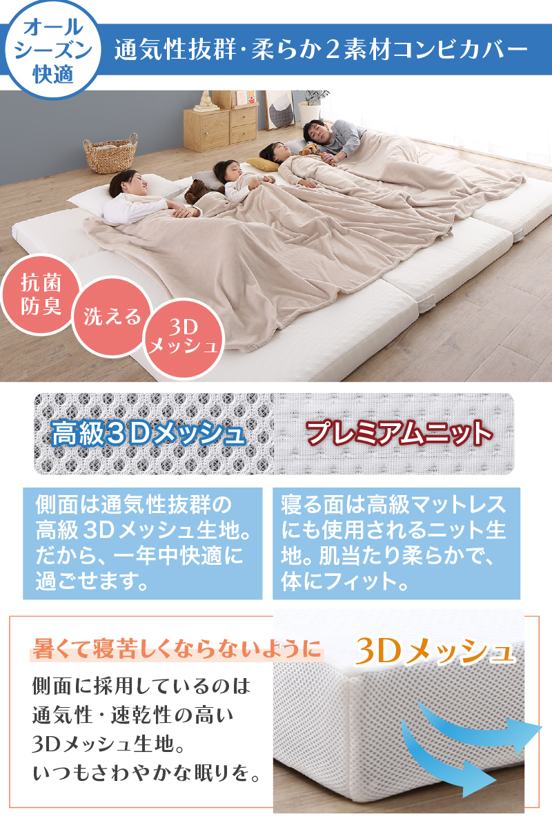 マットレス ワイドキング 連結 ファミリー 敷き布団 大きい 極厚 家族 5人 4人 3人 折りたたみ 抗菌 防臭 通気性 高反発 マットレス敷布団 幅300cm 厚さ8cm