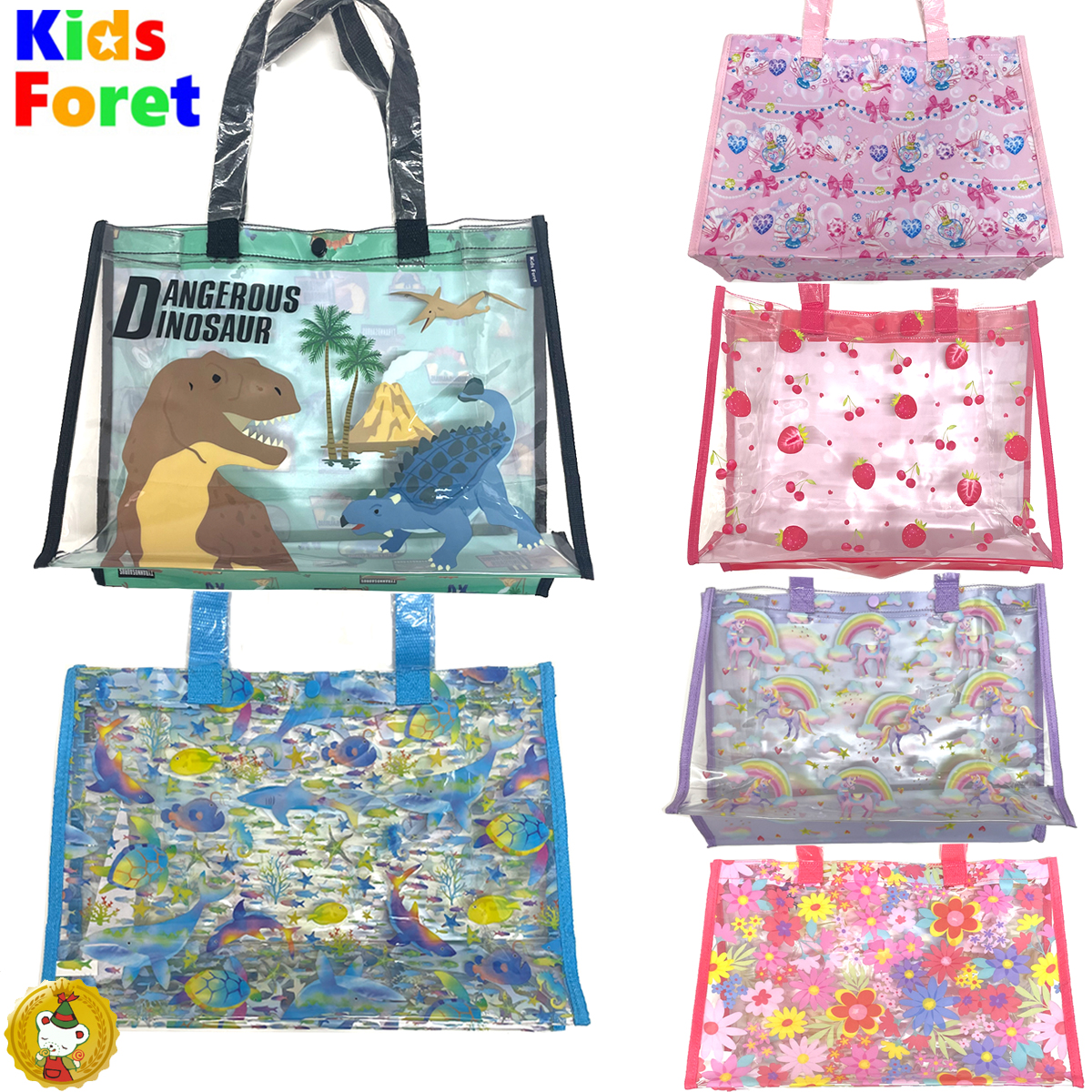 表と裏で柄違いのビニールプールバッグ。 男の子には恐竜と海の仲間の2柄 女の子にはユニコーンとベリー&チェリー・ジュエル&シェル・フラワー柄の3柄です。