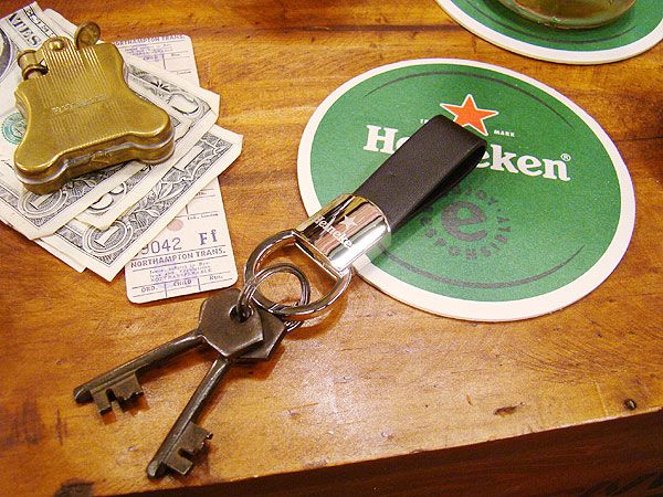フェイクレザーにピカピカのクロームボディがカッコイイ、ハイネケンの非売品キーホルダーです。