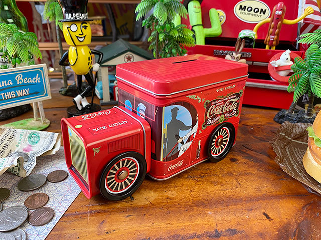 コカ・コーラのデリバリートラックをモチーフにしたユニークなブリキ缶バンクです。