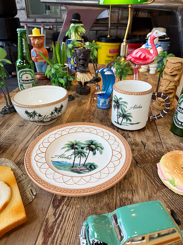 パームツリー柄の陶器製プレート&ボウル&マグ3点セットです。