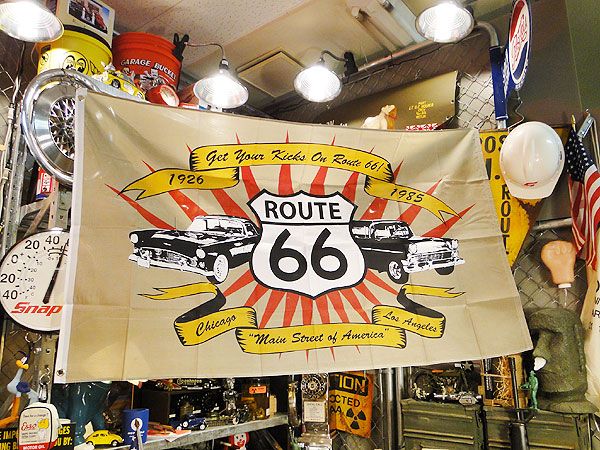 ルート66のロードサインとアメ車のゴールデンショットがビッグサイズフラッグになって登場です!