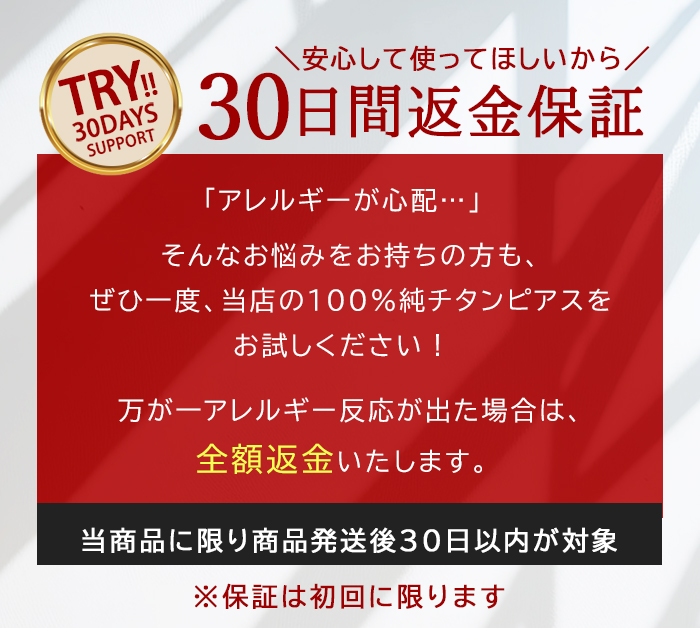 あり 純チタン製 ※純チタンは被膜により表面が大変滑らかなため、ステンレス等に比べるとキャッチがゆるめになります。 セカンドピアスとしてつけっぱなしにされる方や心配な方は、別売りの「落ちないキャッチ」をご利用ください。 |