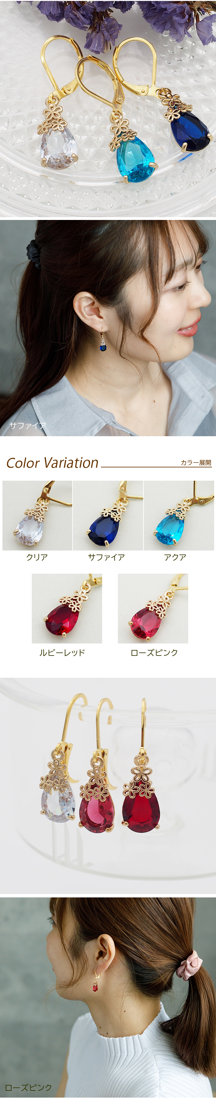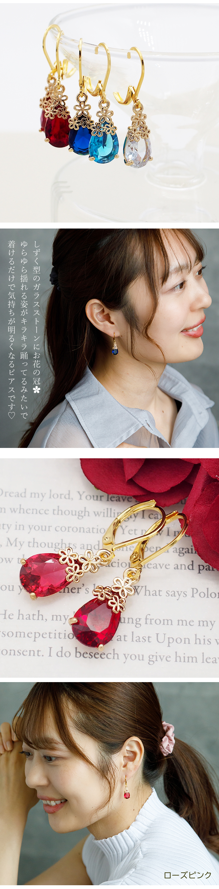 着脱簡単で引っかからない中折れフープとゆらゆら揺れるフックピアスの良いとこ取りな、まったく新しい形のフックピアスができました! 透き通る色とりどりのしずく型ストーンの上に、ちょこんとかわいいお花の冠💓 童話のような愛らしさながら、シンプルなカラー&形で、大人女性も気軽に着けられる華やかピアスです☺ |