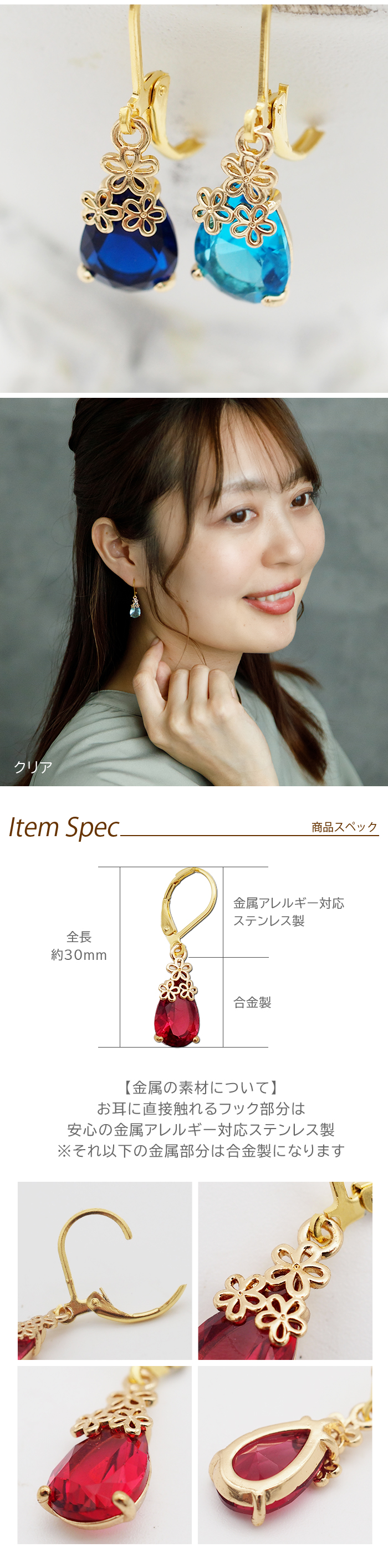 全長:約27mm フック部分:縦約17mm×横約11.8mm ポスト部分太さ:約0.8mm ストーン部分:縦約14.5mm×横約8.0mm×厚み約4.6mm |
