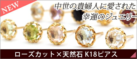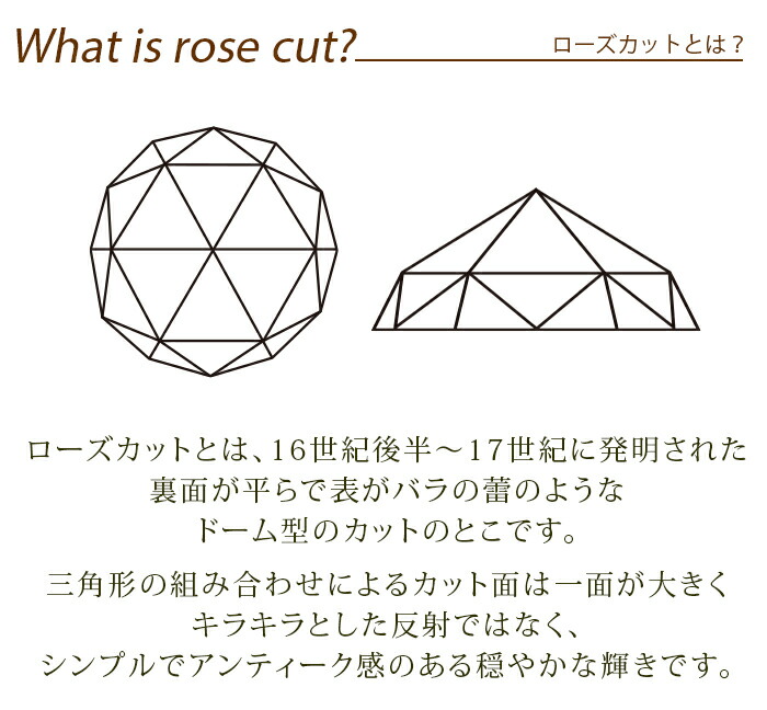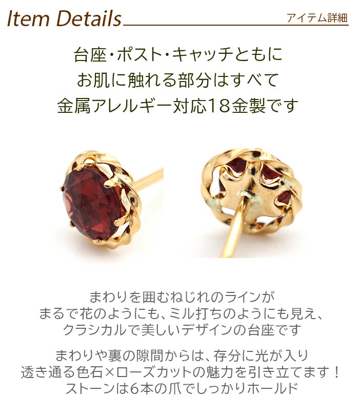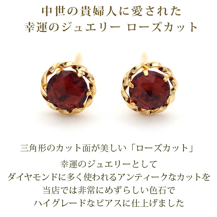 | 中世の貴婦人たちに愛された、三角形のカット面が美しい「ローズカット」。 幸運のジュエリーとしてダイヤモンドに多く使われるアンティークなカットを、当店では非常にめずらしい色石でハイグレードなピアスに仕上げました。 4mmのストーンのまわりを、クラシカルなデザインの台座が包み、ひとまわり大きく華やかな存在感です。 ブリリアントカットのようなキラキラ感は少なくても、まるで水滴のようにみずみずしい透明感とツヤは、思わずうっとりと吸い込まれそうなほど。 古くから世界各地で『神聖な石』として崇められ大切に扱われてきたガーネット。 褐色系の赤が地金のイエローゴールドを通して、オレンジともブラウンともいえない、こっくりと深みのある色合いに。 きらめくローズカットの三角形は、中心に向かって光と影を作り、その奥に届きそうで届かない神聖な雰囲気を醸します。 ぜひ一生物のお守りジュエリーとして、あなたのそばに― |
