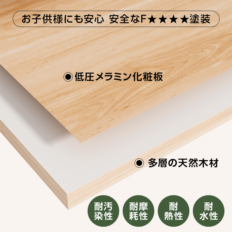 ・低圧メラミン化粧板は、木質系ボードの基材に化粧紙(チタン紙)にメラミン樹脂を含浸させています。