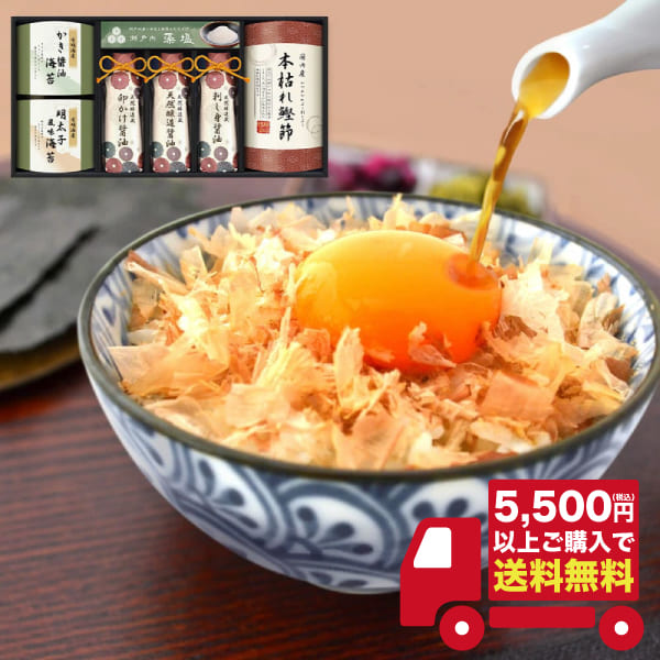〇内容:有明海産味付海苔(8切8枚)×2、天然醸造蔵仕込み卵かけ醤油200ml×1、天然醸造蔵仕込み刺し身醤油200ml×1、天然醸造蔵仕込み丸大豆醤油200ml×1、天然醸造蔵仕込み天然醸造醤油200ml×1、本枯れ鰹節(焼津産)15g×1