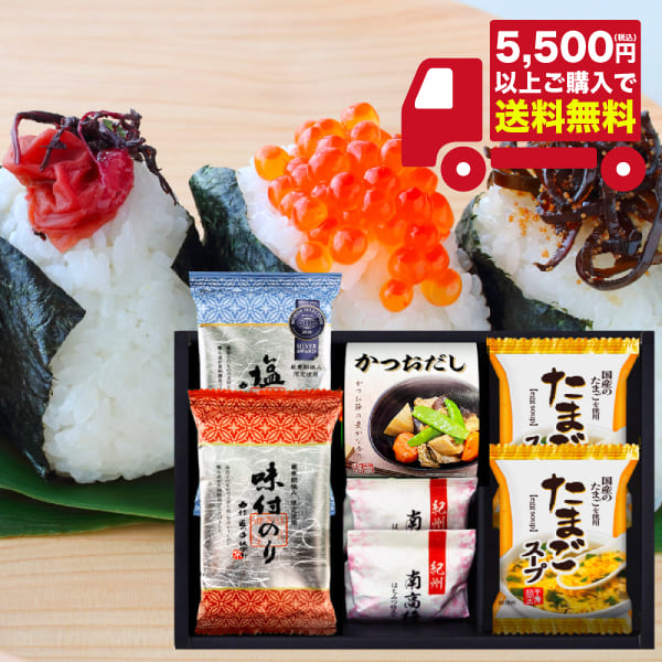 〇商品内容:味付けのり(8切6枚)、有明海産塩のり(8切6枚)、南高梅のり(8切6枚)、紀州南高梅×2、島乃香のり佃煮80g、たまごスープ6.4g×2