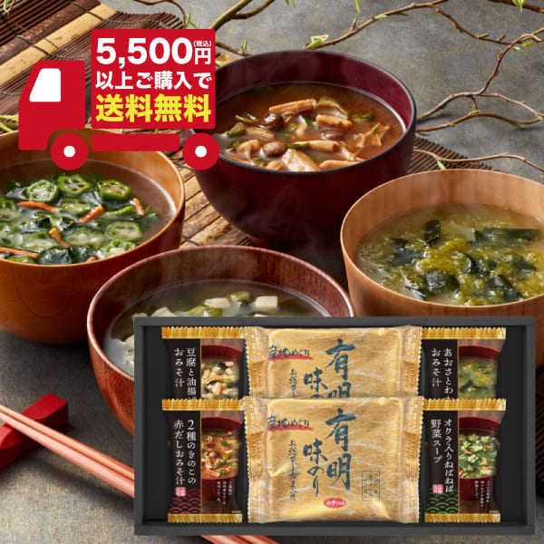 〇商品内容:有明味のり(8切8枚)×2、2種のきのこの赤だしおみそ汁、とうふと油揚げのおみそ汁、あおさとわかめのおみそ汁、オクラ入ねばねば野菜スープ