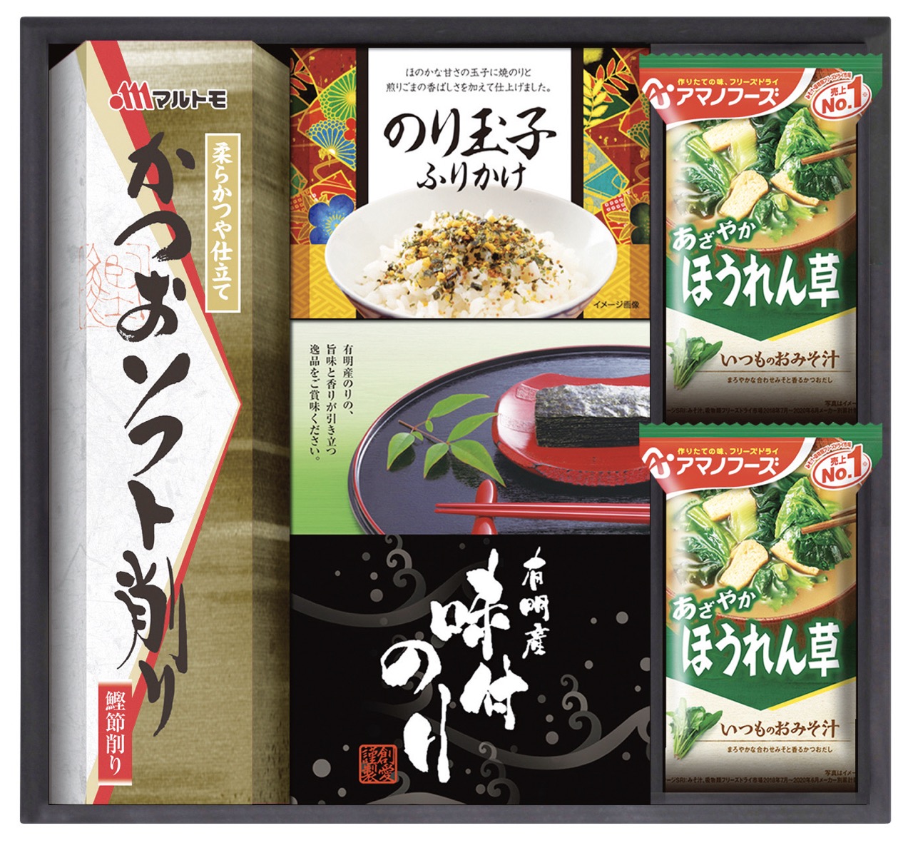 〇商品内容:アマノほうれん草おみそ汁×2・マルトモかつおソフト削り(2g×3袋)・のり玉子ふりかけ(4.5g×2袋)・有明海産味付のり(8切8枚×2袋)