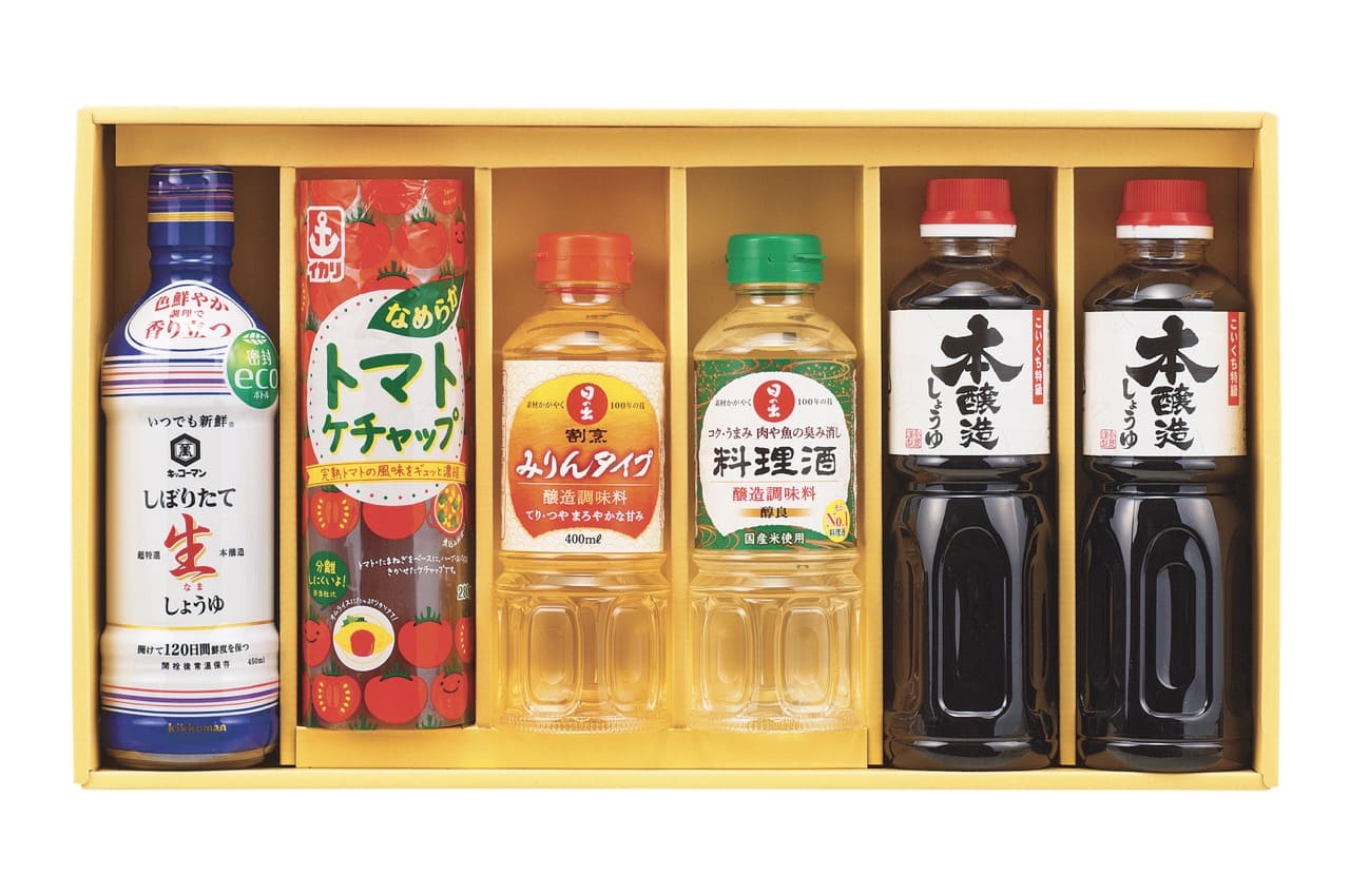 〇商品内容:キッコーマンいつでも新鮮しぼりたて生しょうゆ450ml・サンビシ本醸造しょうゆ500ml×2・イカリなめらかトマトケチャップ280g・日の出(料理酒・割烹みりんタイプ)各400ml