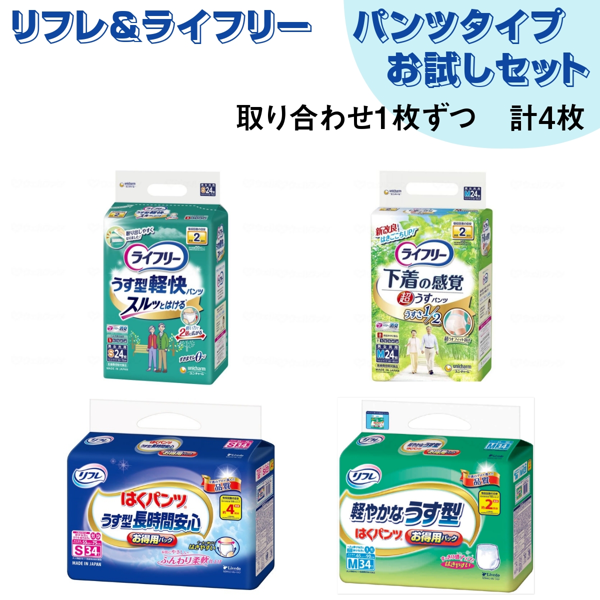 パンツ型おむつ 大人用紙おむつお試し 有料サンプルセット ライフリー&リフレ 各1枚×4枚セット はくパンツタイプ 介護 病院 施設 尿漏れ