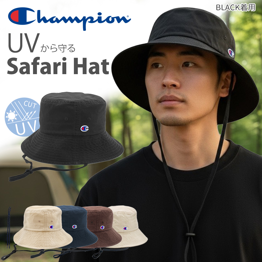 アドベンチャーハット サファリハット 帽子 メンズ uvカット チャンピオン 紐付き 小顔 女優 女優帽 つば長 つば広 ひも付き バケットハットハット 深め Champion ブランド 紫外線 日よけ 日除け 日焼け防止 メンズ コード バケハ 夏 秋