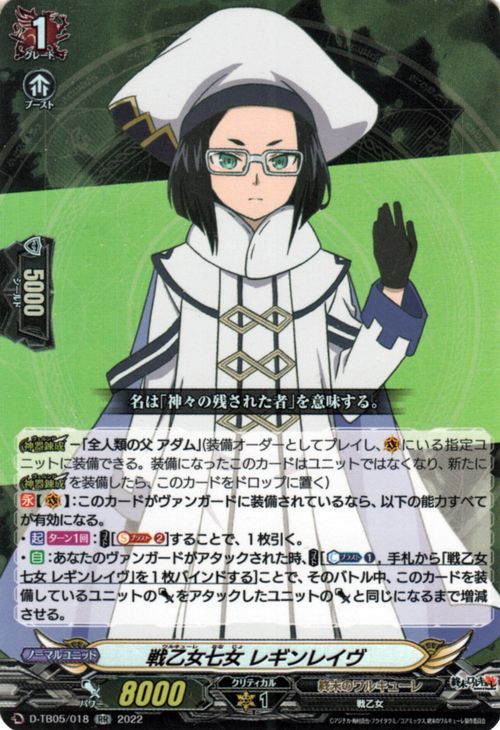 ・【自】:あなたのヴァンガードがアタックされた時、【コスト】[【カウンターブラスト】(1),手札から「戦乙女七女 レギンレイヴ」を1枚バインドする]ことで、そのバトル中、このカードを装備しているユニットのパワーをアタックしたユニットのパワーと同じになるまで増減させる。