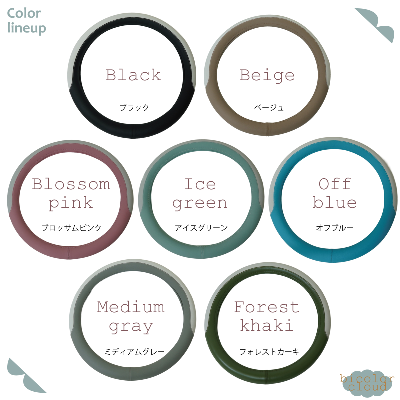 ■バイカラークラウドハンドルカバーSサイズ ■サイズ:S(ハンドル直径36.5センチ〜37.9センチ) ■品質:PVC、心材合成ゴム ■カラー:【全7色】ブラック、ベージュ、ブロッサムピンク、アイスグリーン、オフブルー、ミディアムグレー、フォレストカーキ