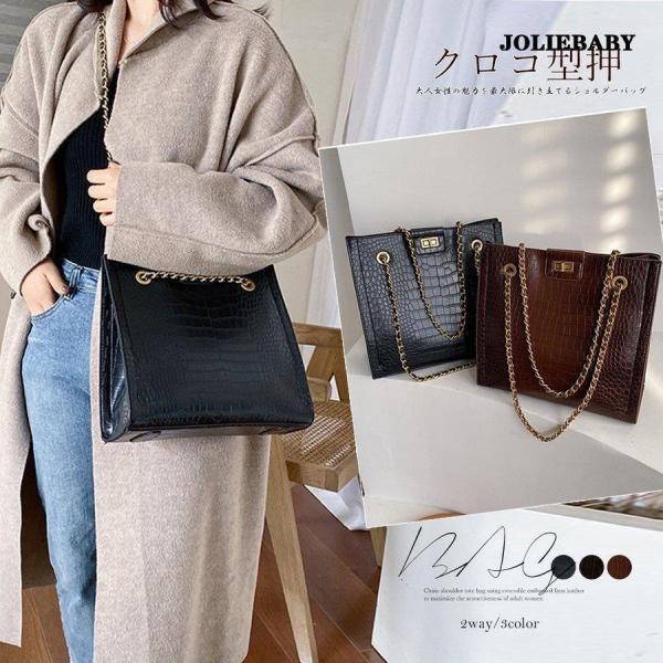 クロコ型押し トートバッグ レディース PUレザーハンドバッグ 大人可愛い 肩掛けバッグ おしゃれ チェーンショルダーバッグ 2way