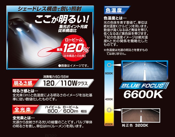 従来のハロゲンバルブと比較して、BD22 ブルーフォーカスは、その明るさと色の鮮明さで一線を画します。