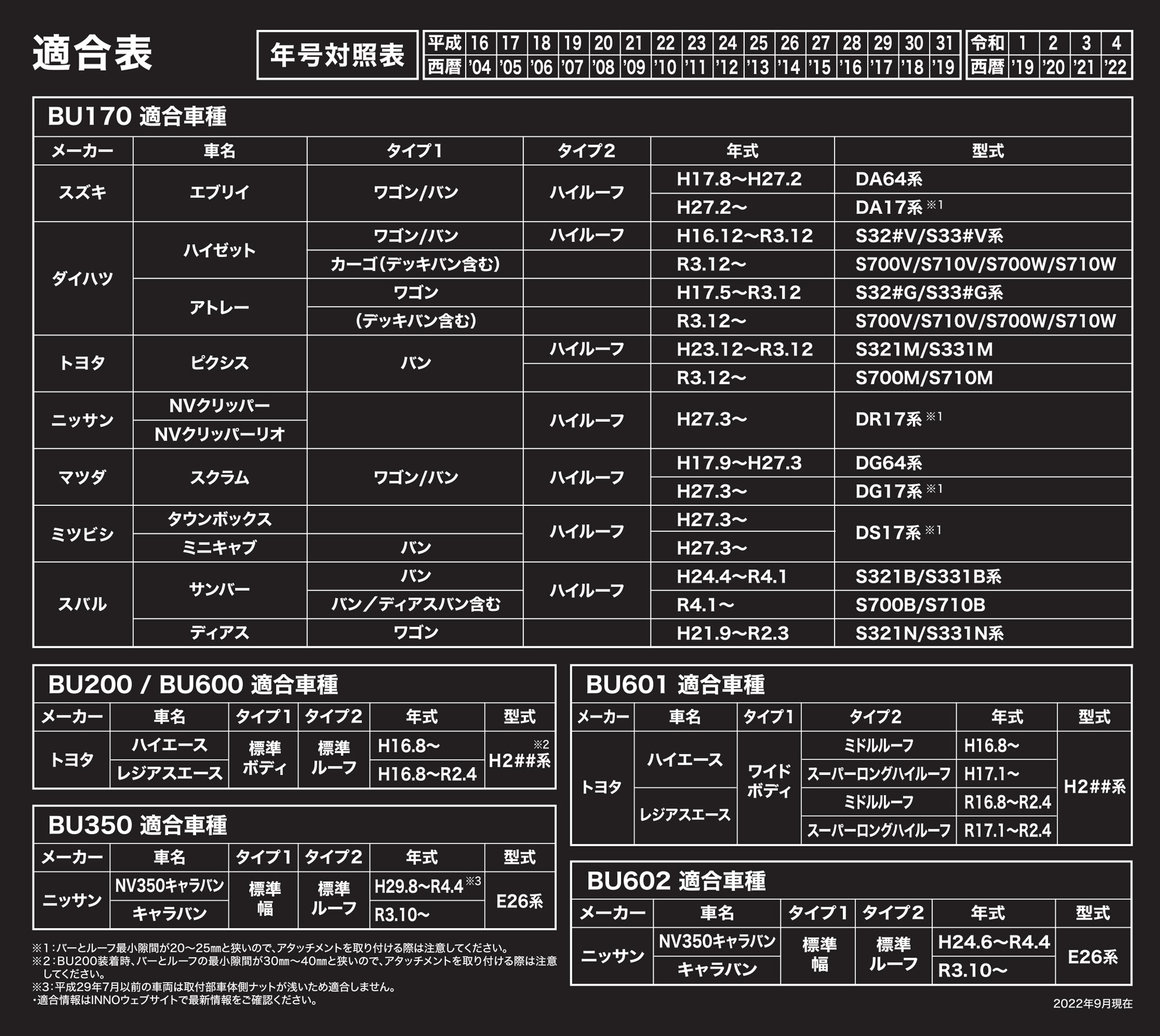 ・BU601 ハイエースワイドボディ専用 適合情報はINNOのホームページ 業務用キャリア 「イノープロシリーズ適合表」で確認できます。
