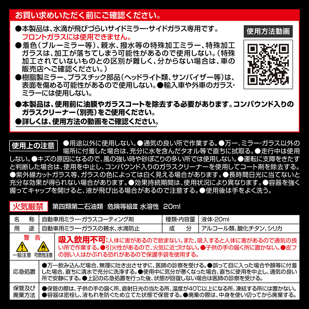 ●用途以外に使用しない。●通気の良い所で作業する。●万一、ミラー・ガラス以外の場所に付着した場合は、充分に水を含んだタオル等で直ちに拭取る。●走行中は使用しない。●キズの原因になるので、風の強い時や砂ぼこりの多い所では使用しない。●運転に支障をきたすと判断した場合は、使用を中止し、コンパウンド入りの油膜落としを使用してコート剤を除去する。●スモークガラスや紫外線カットガラス等、ガラスの色によっては白く見える場合があります。●長時間日光に当てないと充分な効果が得られない場合があります。●効果持続期間は、使用状況により異なります。●容器を強く握ってキャップを開けると、液が飛び出る場合があるので注意する。●使用後は手をよく洗う。