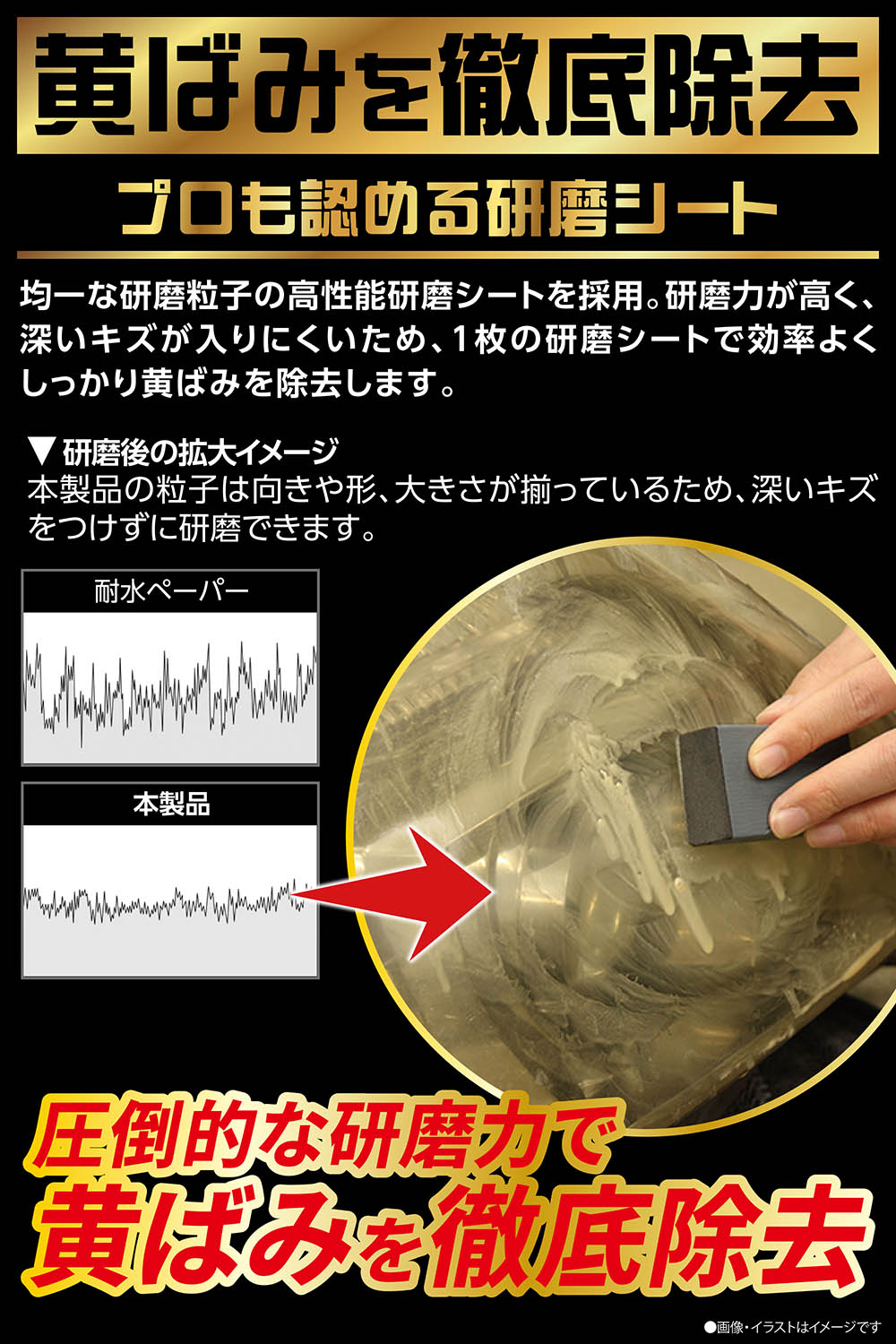 研磨力が高く、深いキズが入りにくいため、1枚の研磨シートで効率よくしっかり黄ばみを除去します。