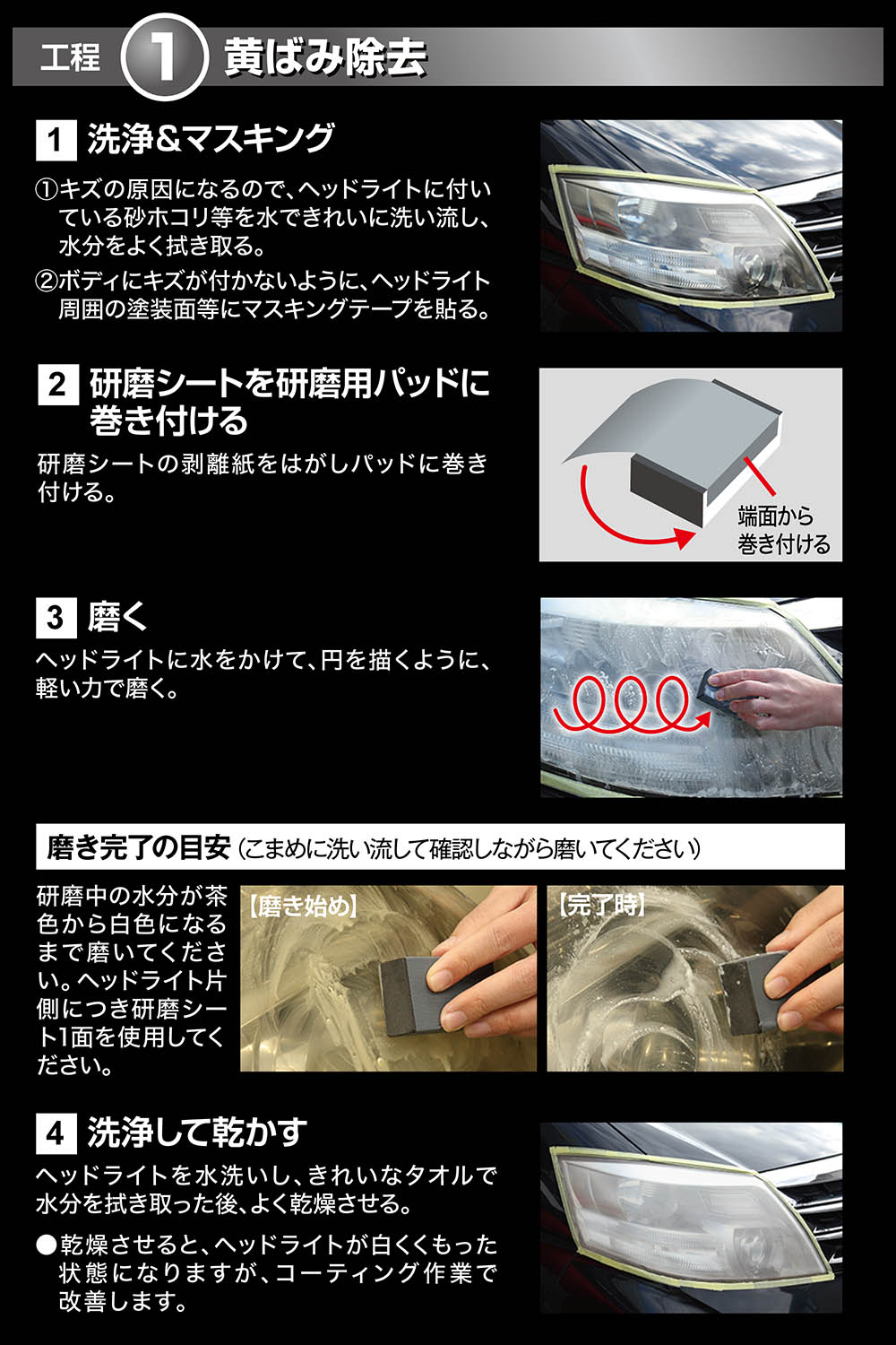研磨中の水分が茶色から白色になるまで磨いてください。ヘッドライト片側につき研磨シート1面を使用してください。