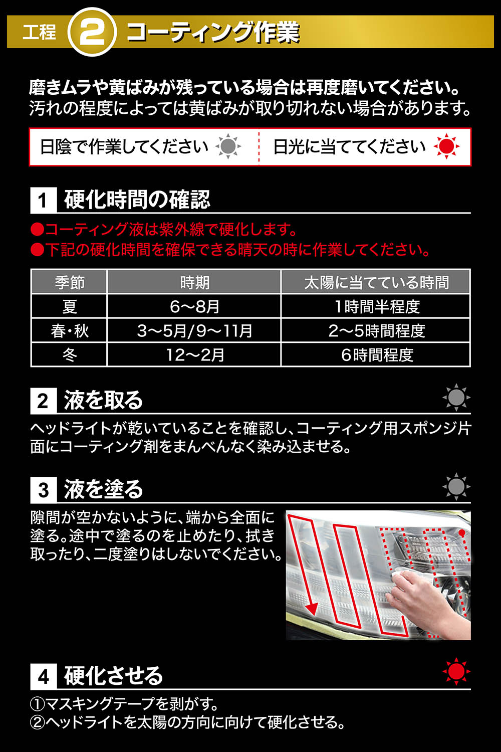 ・ヘッドライトを太陽の方向に向けて硬化させる。