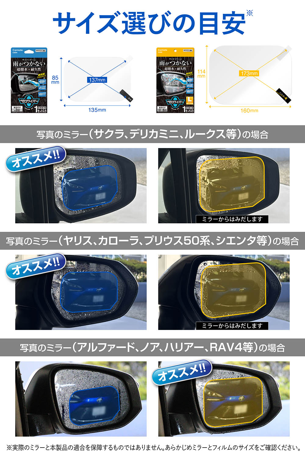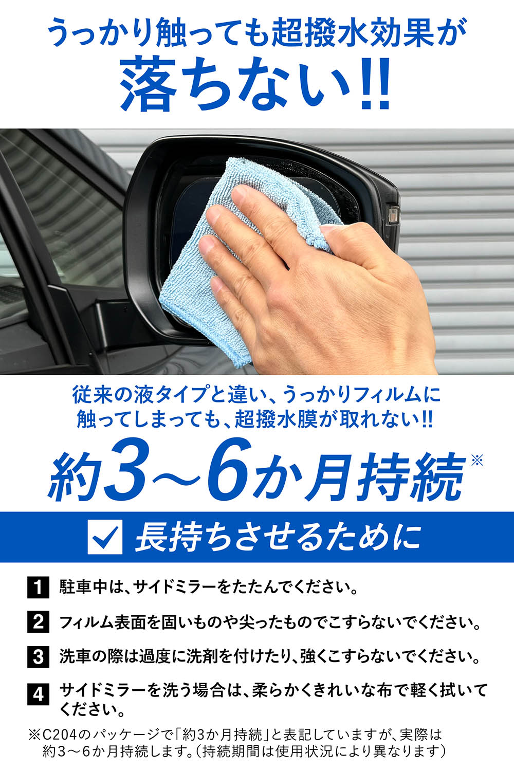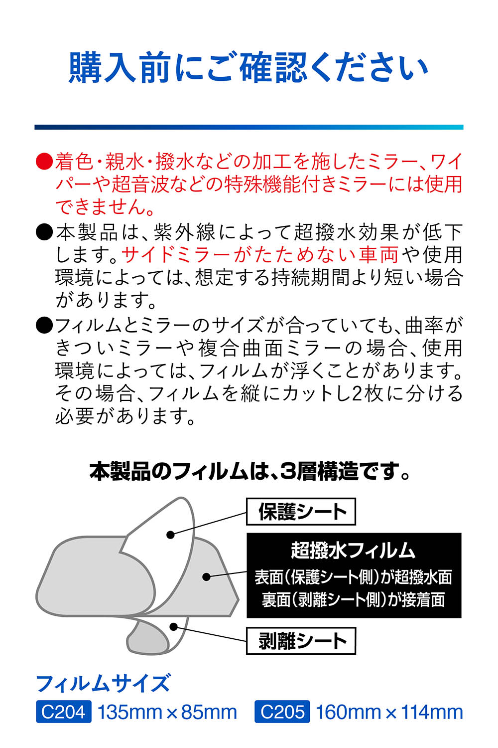 ・本製品は、紫外線によって超撥水効果が低下します。サイドミラーがたためない車両や使用環境によっては、想定の耐久期間に満たない場合があります。