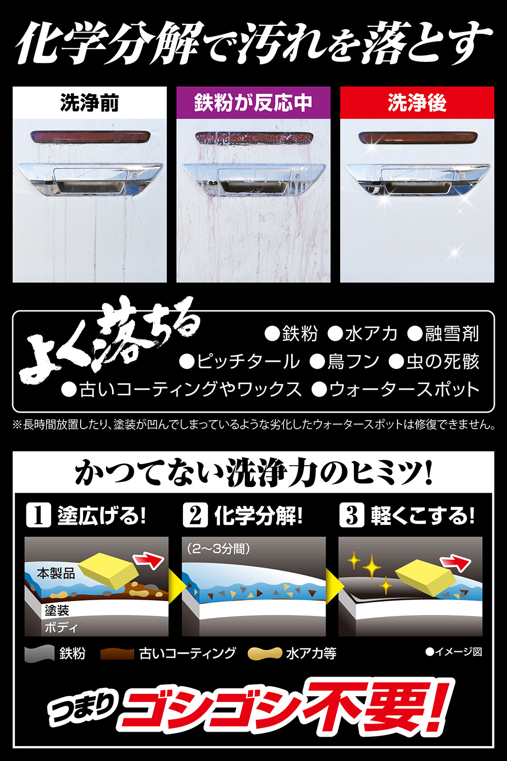 ・ 本製品はコーティングやワックスの被膜も落とします。